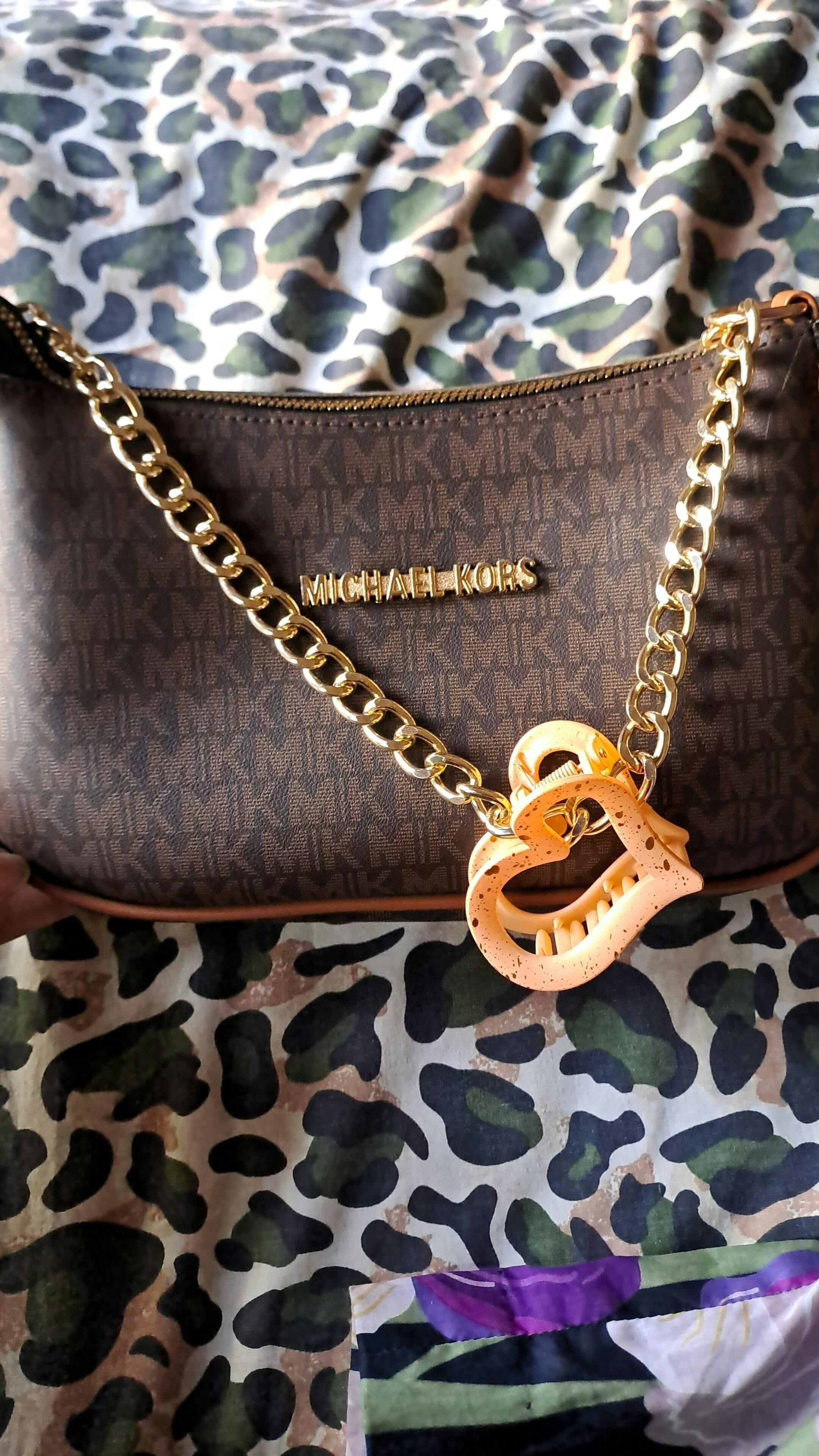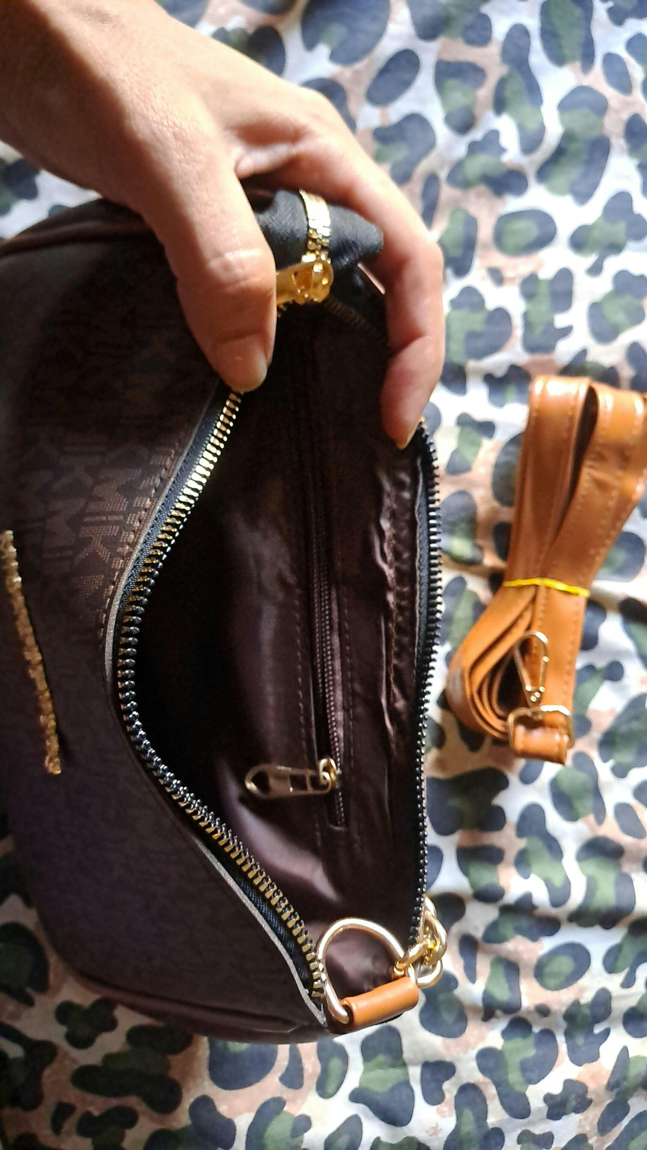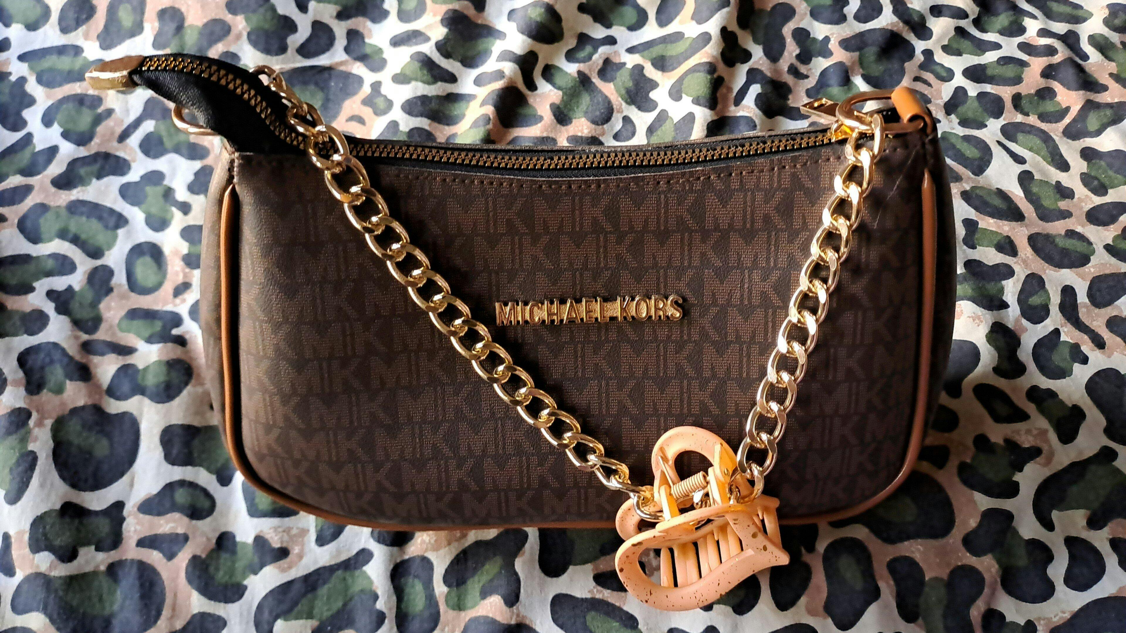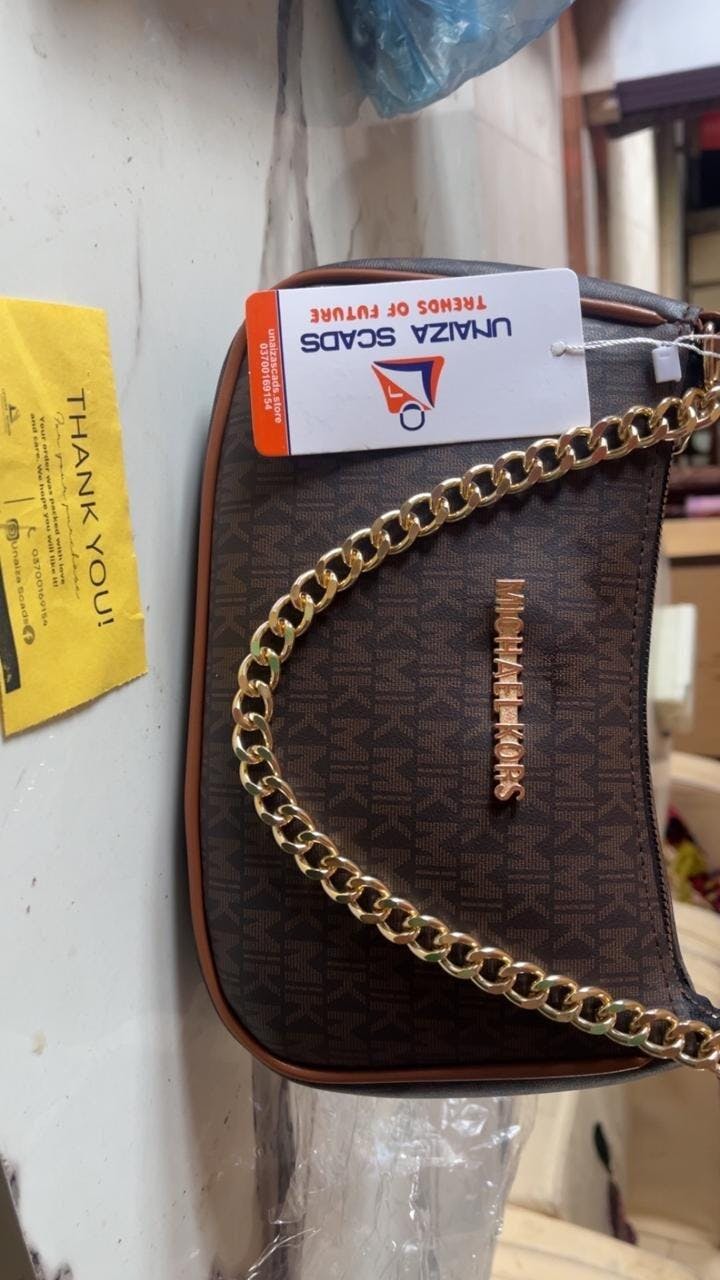 Michael Kors MK Monogram Chain Shoulder Bag – Elevate your style with this luxurious Michael Kors shoulder bag, crafted from premium brown coated canvas with the iconic MK monogram print. Featuring a gold-tone chain detail, sleek leather trims, and the signature Michael Kors logo, this bag blends elegance with everyday practicality. Its zip-top closure ensures security, while the compact crescent shape offers a chic silhouette, perfect for both day and evening wear.