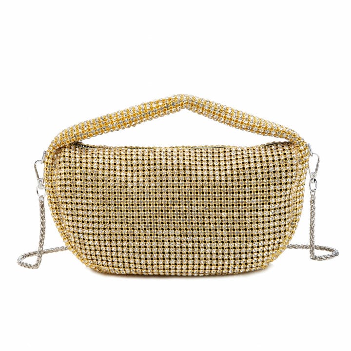 Shine bright at every event with the Rhinestone Crescent Party Bag, a glamorous evening purse designed to make a statement. Its unique half-moon shape and all-over gold rhinestone embellishments create a luxurious, eye-catching sparkle that elevates any outfit.