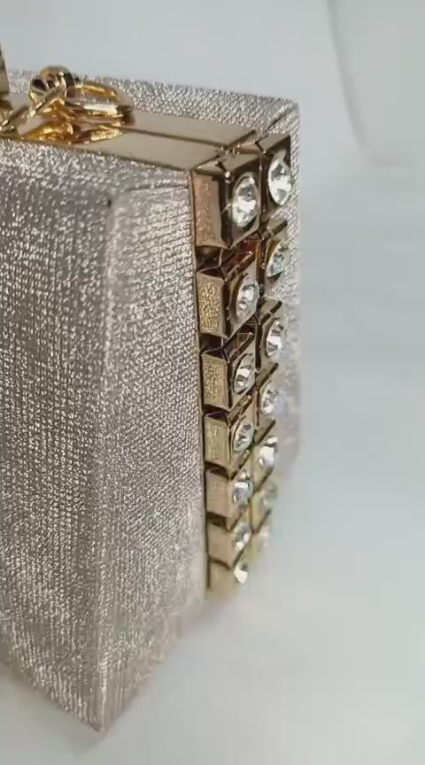 Shine bright with the Stones Studded Radiant Rectangle Box Bag – a perfect blend of glamour and elegance. Designed with a sleek rectangular silhouette, this bag is adorned with dazzling stone embellishments that catch the light from every angle. Its structured box style offers both charm and durability, while the detachable chain strap allows you to wear it as a chic crossbody or carry it gracefully as a clutch. Ideal for weddings, parties, and festive occasions, this bag adds a sparkling statement to any outfit.