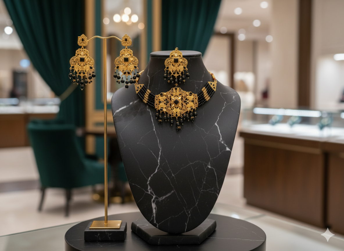 “Opulent gold-plated bridal choker set featuring traditional Kundan style stone-setting, interspersed with lustrous pearls. The neckpiece is designed to sit elegantly around the collarbone, with adjustable thread closure for custom fit. Matching drop earrings mirror the choker’s floral motif and gemstone palette. Ideal for a red/maroon wedding lehenga, this set brings regal craftsmanship and timeless appeal to your bridal ensemble.”