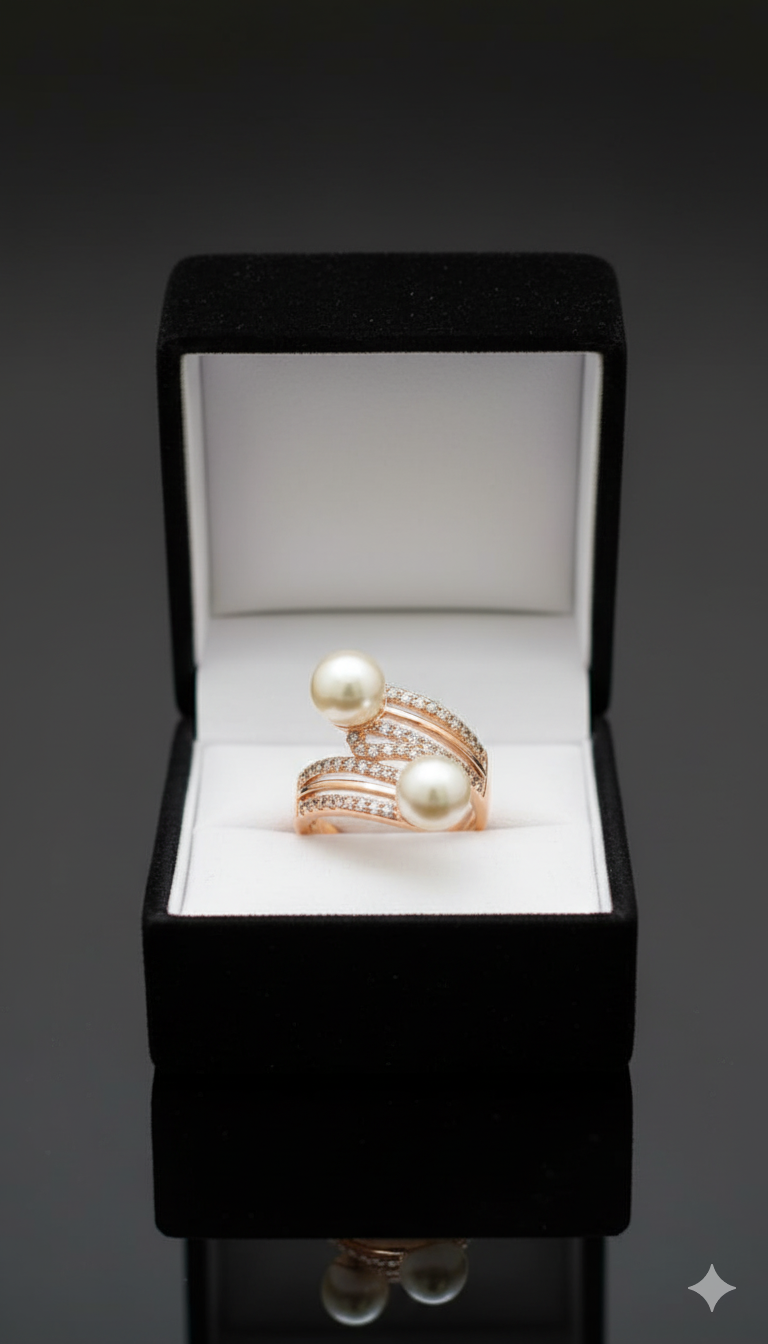 Embrace timeless sophistication with the Venus Glow Adjustable Ring. This exquisite piece features two luminous pearl accents delicately set on a rose gold band encrusted with sparkling cubic zirconia. The open, adjustable design ensures a comfortable fit while adding a touch of modern grace. Perfect for both everyday elegance and special occasions, this ring radiates femininity and refined charm.
